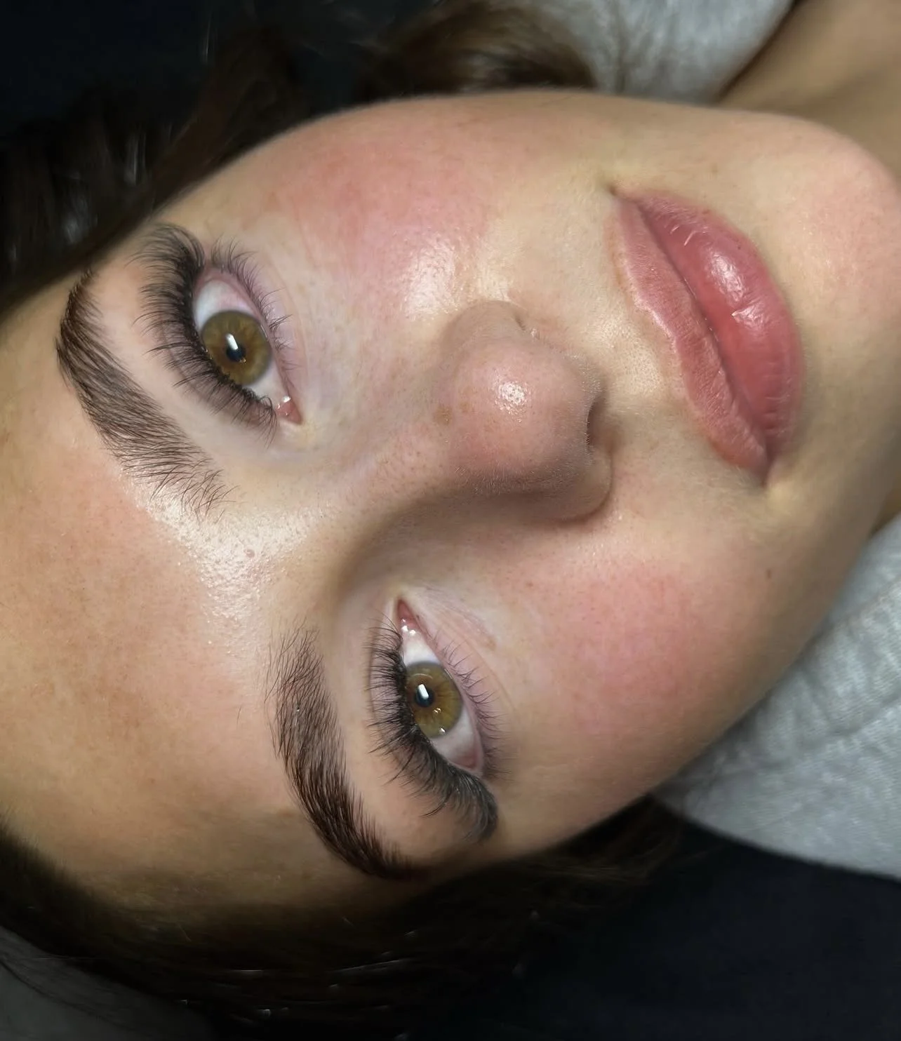 Close-up of a woman's face with brown eyes, full lips, and dark hair, lying down with one eye closed and the other open.